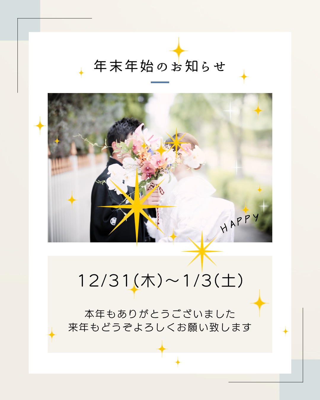 年末年始のお休みは、2025年12月31日~2026年1月3日までの間です。 2…